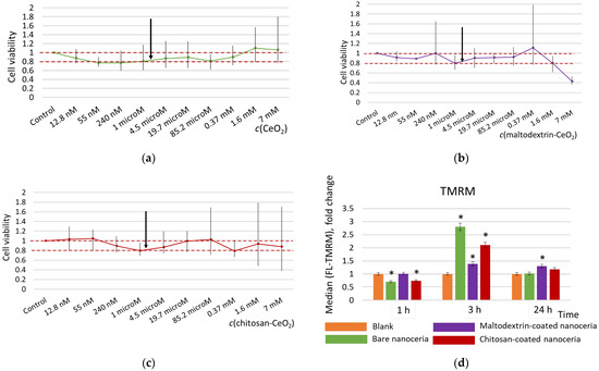 Cell viability for (a) bare nanoceria, (b) maltodextrin-coated nanoceria, and (c) chitosan-coated nanoceria assessed with a 72 h MTT test; the red dotted line indicates the viability limits of 80–100%, and the arrows indicate a concentration of 1.5 μmol/L selected for the further experiments. (d) Mitochondrial membrane potential for the cells exposed to bare, maltodextrin-, and chitosan-coated nanoceria (1.5 μmol/L); the data are presented in arbitrary units compared to the control values, and the control cells were incubated without nanoparticles. ‘*’ indicates significant differences relative to the control using the Mann–Whitney U test at a significance level of p = 0.05.