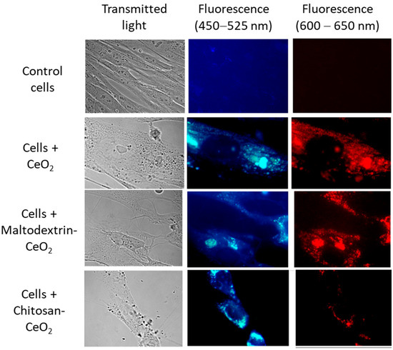 The intrinsic red fluorescence of nanoceria allows for the visualization of its accumulation in cells [68]. Images of control cells and cells exposed to nanoparticles (1.5 μmol/L) for 3 h are shown in Figure 2. The images indicate that bare, maltodextrin-, and chitosan-coated nanoceria nanoparticles actively enter the cells.