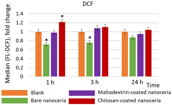 Intracellular ROS concentrations compared to the control values assessed by flow cytometry with dichlorofluorescein (DCF), a product of intracellular oxidation of 2′,7′-dichlorodihydrofluorescein diacetate; the cells were exposed to bare, maltodextrin-, and chitosan-coated nanoceria (1.5 μmol/L) within 1, 3, and 24 h. The data are presented in arbitrary units compared to the control values; the control cells were incubated without nanoparticles. ‘*’ indicates significant differences relative to the control using the Mann–Whitney U test at a significance level of p = 0.05.