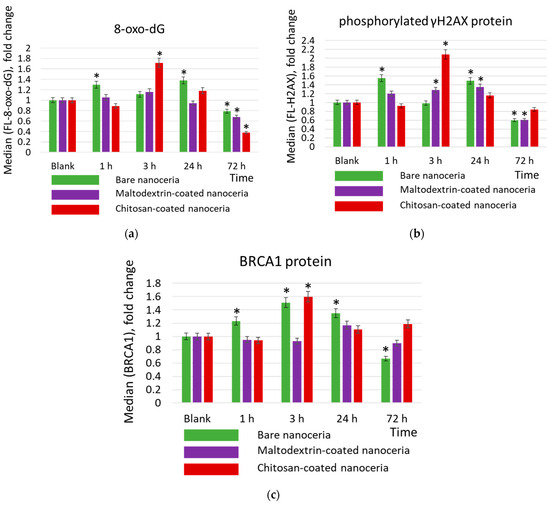 Concentrations of (a) 8-oxo-2′-deoxyguanosine (8-oxo-dG), (b) phosphorylated γH2AX, protein, and (c) BRCA1 protein in cells exposed to bare, maltodextrin-, and chitosan-coated nanoceria (1.5 μmol/L) for 1–72 h. The data are presented in arbitrary units compared to the control values; the control cells were incubated without nanoparticles. ‘*’ indicates significant differences relative to the control using the Mann–Whitney U test at a significance level of p = 0.05.