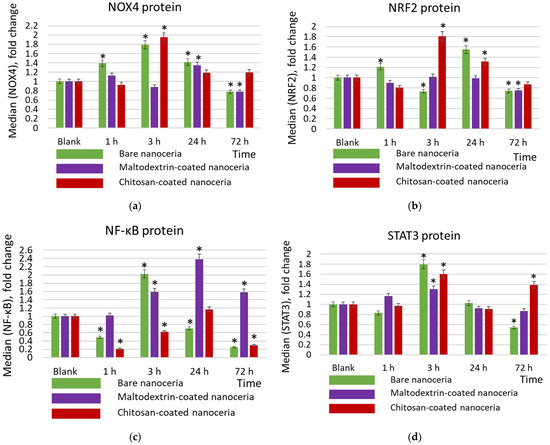 Expression of proteins (a) NOX4, (b) NRF2, (c) NFκB, and (d) STAT3 in cells exposed to bare, maltodextrin-, and chitosan-coated nanoceria (1.5 μmol/L) for 1–72 h. The data are presented in arbitrary units compared to the control values; the control cells were incubated without nanoparticles. ‘*’ indicates significant differences relative to the control using the Mann–Whitney U test at a significance level of p = 0.05.