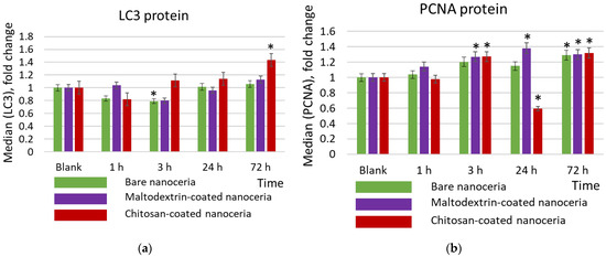 Autophagy is a process in which internal cell components are degraded in lysosomes or vacuoles. Microtubule-associated protein 1A/1B-light chain 3 (LC3) is a reliable biomarker for autophagy and autophagy-related processes [69]. As for LC3, chitosan-coated nanoceria causes an activating effect after 72 h of exposure, in contrast to bare and maltodextrin-coated nanoceria, which are characterized by a weak suppressive effect after 3 h of exposure, and then the LC3 content does not differ from the control value (Figure 6a).