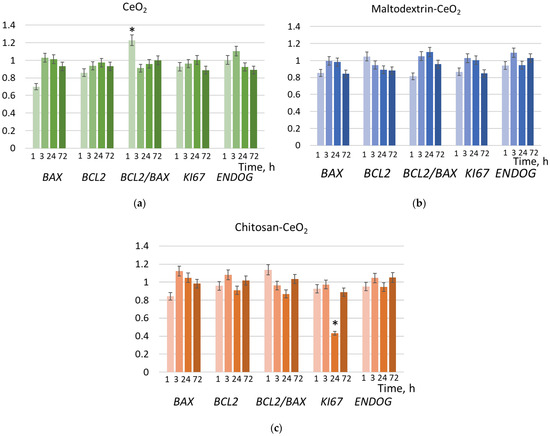 To prove the suppressing effect of chitosan-coated nanoparticles on proliferation within 24 h, we studied the expression of genes involved in proliferation by the real-time quantitative reverse transcription polymerase chain reaction method (qRT-PCR). These are the proapoptotic gene BAX, the anti-apoptotic gene BCL2, and their ratio, BCL2/BAX, as well as Ki-67 (a gene encoding the protein, which is a proliferation marker) and ENDOG (mitochondrial endonuclease G) (Figure 7). From this data, it follows that incubation of nanoparticles with cells has a minimal effect on apoptosis. However, indeed, at 24 h, chitosan-coated CeO2 causes a significant decrease in the expression of the Ki-67 gene by more than two times (Figure 7c).