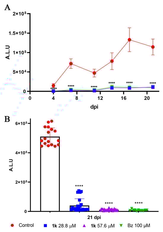 Effect of 1k on the in vitro reversibility of infection. T. cruzi-infected Vero cells were treated for 10 days with 1k and Bz, followed by an additional 10 days in culture without the drugs. (A) The release profile of trypomastigotes in the supernatant from untreated T. cruzi-infected Vero cells and those treated with 1k (28.8 µM and 57.6 µM) and Bz (100 µM). (B) The infection profile of the cell monolayer at 21 days post-infection (dpi). The results are expressed in arbitrary luminescence units (A.L.U). Statistical analysis was performed using the One-Way ANOVA test, followed by the Kruskal–Wallis test, where p ≤ 0.0001 (****) was considered statistically significant compared to the untreated control.
