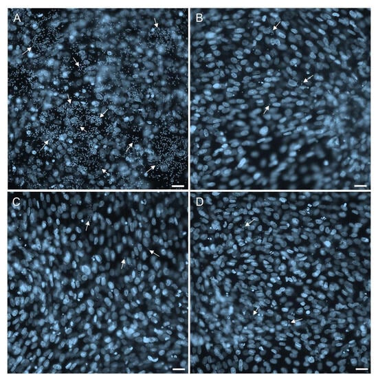 The effect of 1k on preventing the reactivation of infection in vitro is demonstrated by fluorescence images of T. cruzi-infected Vero cells stained with DAPI. (A) Untreated cultures of Vero cells infected by T. cruzi (Dm28c-Luc) for 4 days. All treated groups were infected for 24 h, treated for 10 days, and then the monolayers were fixed at 21 days post-infection (dpi). (B,C) T. cruzi-infected Vero cell monolayers treated with 1k at concentrations of 28.8 µM (B) and 57.6 µM (C). (D) Bz treatment of T. cruzi-infected Vero cells at 100 µM. Arrows indicate intracellular parasites. Images were acquired using the ImageXpress Micro XLS high-content screening (HCS) system (Molecular Devices, Sunnyvale, CA, USA). Bar = 20 µm.