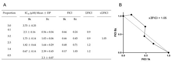 To enhance the antiparasitic effect of 1k, we conducted an in vitro synergy assessment with Bz against intracellular amastigote forms of T. cruzi. We first established the maximum concentration for each compound and determined their respective IC50 values, yielding 90 µM for derivative 1k and 61 µM for Bz. Based on these concentrations, we formulated a series of combination ratios: 5:0 (90:0 µM), 4:1 (72:12 µM), 3:2 (54:24 µM), 2:3 (36:36 µM), 1:4 (18:48.8 µM), and 0:5 (0:61 µM). The results demonstrated that the sum of fractional inhibitory concentrations (∑FICI) varied between 0.9 and 1.2, with a mean ∑FICI (x∑FICI) of 1.05, indicating an additive interaction (x∑FICI range for additivity: 0.5–4). The table in Figure 5A details the IC50 values, FICI, ∑FICI, and x∑FICI for each compound tested. Additionally, the isobologram presented in Figure 5B corroborates that all tested compound ratios exhibited additive interactions.