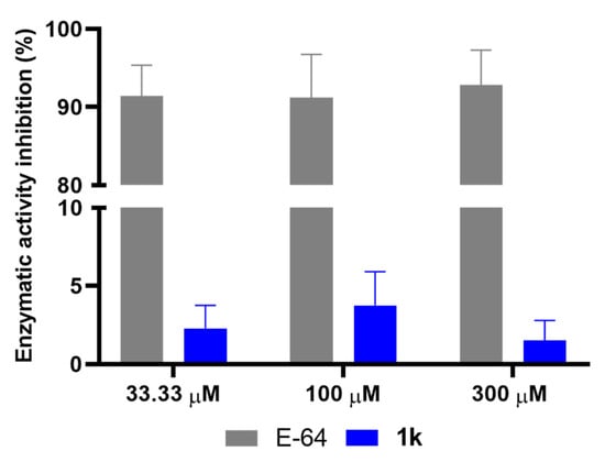 Effect of 1k on T. cruzi cysteine protease activity. Protein extracts of trypomastigotes (5 µg) were incubated at 37 °C for 90 min with different concentrations of 1k (33.33, 100, and 300 µM) and the irreversible cysteine protease inhibitor E-64 as a control. Cysteine protease activity was measured after the addition of the substrate Z-Phe-Arg-AMC (30 µM). Results are presented as a percentage of proteinase activity (%) and represent the median of three analyses. Approximately 100% of activity is relative to 56.3 × 105 μmolmin−1 mg of protein−1.
