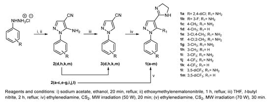 The desired compounds 1(a–m) were synthesized according to the synthetic pathway outlined in Scheme 1. Firstly, arylhydrazine hydrochlorides were subjected to an acid–base reaction, using sodium acetate and ethanol as solvent, under reflux for 20 min. After that, ethoxymethylenemalononitrile was slowly added to provide a condensation reaction, followed by cyclization, while maintaining reflux for 1 h to afford 2(a–m) in 49–99% yields. In the next step, an aprotic deamination reaction was performed to achieve four key intermediates 3(d,h,k,m) in 87–99% yields, starting from 2(d,h,k,m), t-butyl nitrite, and tetrahydrofuran (THF), under reflux for 2 h. No characteristic bands related to the NH2 group were observed, confirming that the deamination reaction occurred. The syntheses of the final compounds were carried out for 2(a–c,e–g,i,j,l) and 3(d,h,k,m) to achieve 1(a–c,e–g,i,j,l) and 1(d,h,k,m), respectively, using ethylenediamine and carbon disulfide (CS2), under microwave irradiation conditions. In the case of 1(a–c,e–g,i,j,l), the power was 70 W and the reaction time was 30 min, while lower power (50 W) and shorter reaction time (20 min) were required to obtain 1(d,h,k,m). The compounds were isolated in yields ranging from 27 to 95%. They were completely characterized by FT-IR, 1H NMR, 13C NMR, HRMS, and melting point analyses. 1(c,d,g–m) derivatives are being published for the first time, while the synthesis of 1a [34,35], 1b [34,35,36], 1e [35], and 1f [35] have already been reported by our research group.
