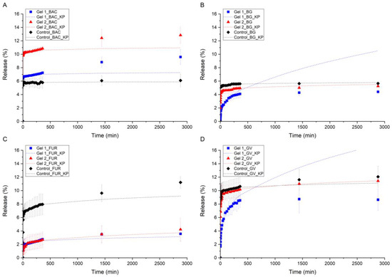 A curve-fitting analysis suggested that the kinetic models of the APIs release from Gels 1 and 2 conform to the Korsmeyer–Peppas model [64,66], which was fitted with the overall highest coefficients of determination (R2) for all studied samples, BAC, BG, GV, and FUR (Tables S3–S6). Therefore, cumulative API release in time is presented with the fitted Korsmeyer–Peppas kinetic model in Figure 2. The Korsmeyer–Peppas model is given below: