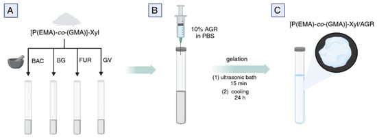 Control samples were prepared similarly, except that no [P(EMA)-co-(GMA)]-Xyl oligomer was used. The plastic tubes were put in an ultrasonic bath for 15 min to homogenize the mixture and then placed in the refrigerator overnight to gel, giving [P(EMA)-co-(GMA)]-Xyl/AGR gel. Thus prepared, the tubes were ready to determine the release of the API. The procedure for obtaining drug-loaded gels is shown in Figure 3.