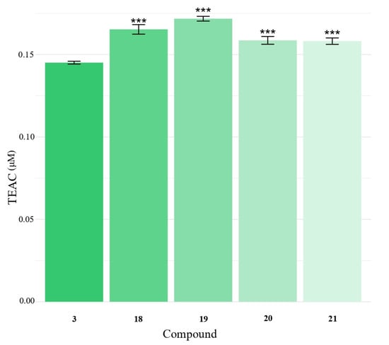 ABTS assay of hydroxyalkyl esters 18–21 compared with 4-hydroxy-3-methoxyphenylacetic acid 3. TEAC values (μM) are expressed as the mean ± standard deviation (n = 3). Dunnett’s post hoc test was applied to compare the samples with 3. The analysis revealed significant differences in the TEAC values between hydroxyalkyl esters 18–21 and 3. The results show that 18–21 exhibited significantly lower TEAC values compared with 3, exhibiting higher antioxidant activity (*** p < 0.001).