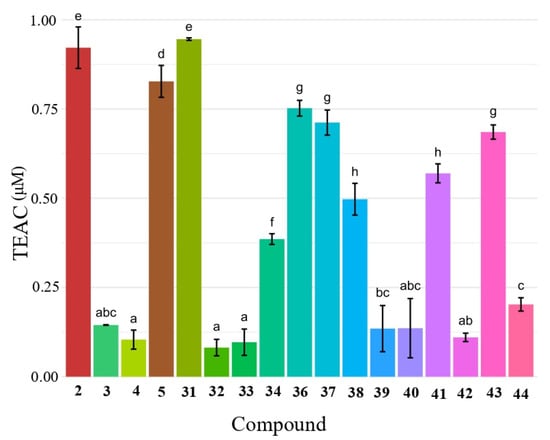 The DPPH and ABTS values of butyl diarylacetates 31–34 and 36–44 were also statistically analyzed and compared with hydroxyphenylacetic acids 2–5 using the post hoc Tukey test (Figure 5 and Figure 6). Data on compound 30 are not included for high DPPH and low ABTS values.