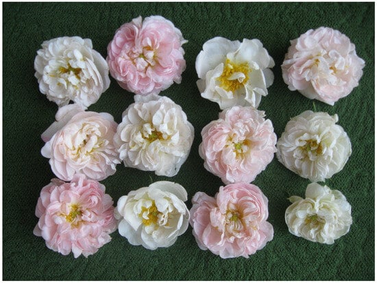 - Rusanov, K.; Kovacheva, N.; Rusanova, M.; Atanassov, I. Flower Phenotype Variation, Essential Oil Variation and Genetic Diversity among Rosa alba L. Accessions Used for Rose Oil Production in Bulgaria. Sci. Hortic. 2013, 161, 76–80. [Google Scholar] [CrossRef]