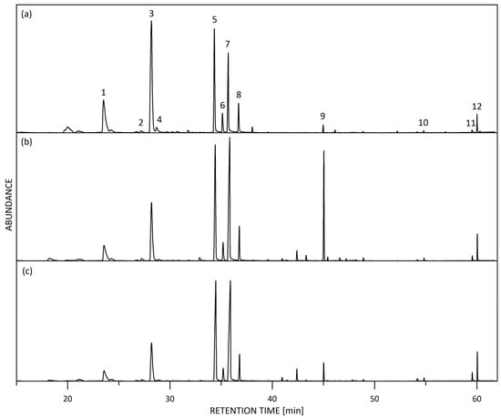 Representative HS-SPME-GC/MS total-ion current (TIC) chromatogram of fresh R. alba flowers: (a) Petals mix; (b) Whole blossom white; (c) Whole blossom pink. Main components: 1. Benzyl alcohol, 2. cis-Rose oxide, 3. 2-Phenyl ethyl alcohol, 4. trans-Rose oxide, 5. β-Citronellol + Nerol, 6. Z-Citral (Neral), 7. Geraniol, 8. E-Citral (Geranial), 9. trans-β-Caryophyllene, 10. Heptadecane, 11. Nonadecene, 12. Nonadecane.