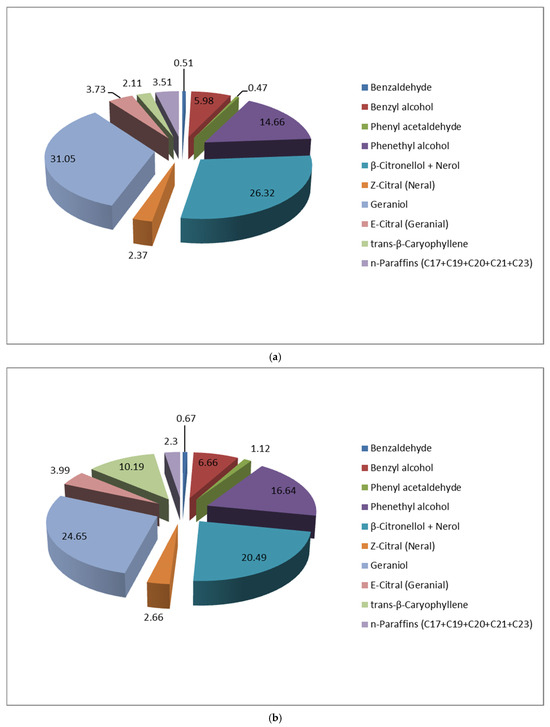 Esters of 2-phenylethyl alcohol and the most abundant monoterpene alcohols geraniol, citronellol, and nerol, with acetic acid, were mainly found in a total amount of 0.15–4.79%.