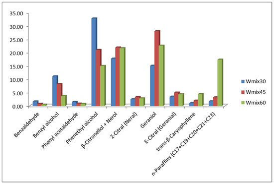 Effect of the extraction temperature (30–60 °C) on the VOCs of R. alba mixed whole blossom sample. Legend: Wmix—mixed whole blossom; the numbers 30, 45, 60 indicate SPME performed at 30, 45, 60 °C, respectively.