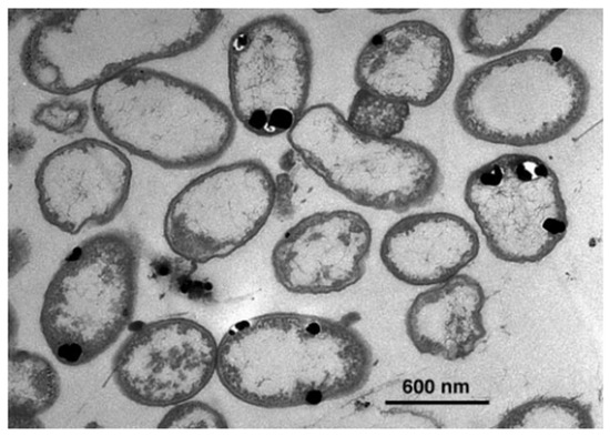 Transmission electron micrograph (TEM) of a thin section of P. stutzeri AG259 cells. Large crystalline Ag0 and Ag2 S particles are deposited between the cell wall and the plasma membrane [43]. (Copyright (1999) National Academy of Sciences, U.S.A.).