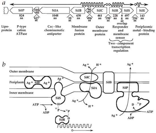 Genetic layout and functional roles of silver resistance determinants. (a) Schematic representation of gene organisation and transcription in the silver resistance operon. Promoter regions and transcription start sites are indicated by open circles; mRNA synthesis is depicted as wavy lines, and gene orientations are shown as arrows. Intergenic nucleotide (nt) distances and gene product sizes (in amino acids, aa) are noted. (b) Predicted protein functions based on homology, involved in Ag+ detection, transport, and detoxification [71]. (Adapted with permission from Springer Nature.).