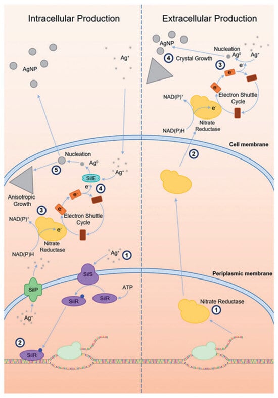 Schematic overview of intracellular and extracellular biosynthesis pathways of AgNPs in microorganisms. The intracellular route involves ion uptake, enzymatic reduction by nitrate reductase, and nanoparticle formation within the cell. In contrast, the extracellular route relies on secreted enzymes and electron shuttles to facilitate Ag+ reduction in the surrounding medium [21]. (Adapted with permission from Taylor and Francis.).