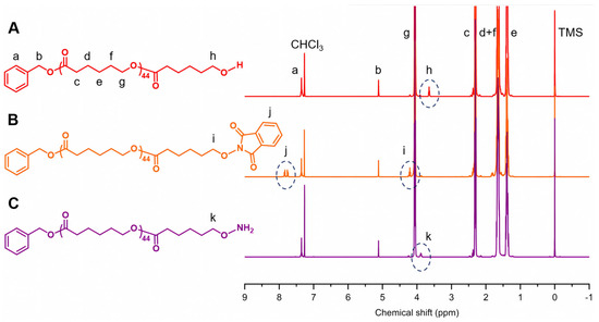 Typical 1H NMR spectra of (A) PCL, (B) PCL−O−NHP, and (C) PCL−ONH2 in CDCl3. The lowercase letters correspond to specific protons in the polymers with their respective signals in the spectra. Tetramethylsilane (TMS) was used as the internal standard.