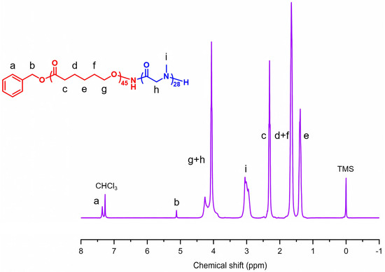 1H NMR spectrum of PCL45-b-PSar28 in CDCl3. The lowercase letters correspond to specific protons in the BCP with their respective signals in the spectrum. Tetramethylsilane (TMS) was used as the internal standard.