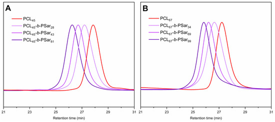GPC traces of PCL homopolymers and PCL-b-PSar BCPs: (A) PCL45 and PCL45-b-PSarn, n = 28, 43, 81; (B) PCL67 and PCL67-b-PSarn, n = 34, 69, 99.