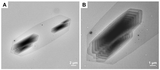 TEM images of PCL45-b-PSar28 self-assemblies prepared in ethanol: (A) Ts = 39.5 °C, Tc1 = 33 °C, Tc2 = 8 °C; (B) magnified view of the lamellar crystal.