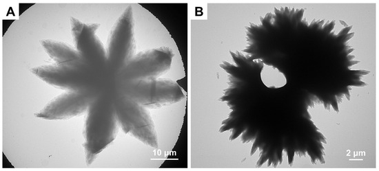 Using the self-seeding and two-step crystallization method, the effect of BCP composition of PCL-b-PSar on the self-assembled morphology was investigated. Figure 5 displays the TEM images of PCL45-b-PSar43 and PCL45-b-PSar81 self-assemblies (magnified views in Figure S4) prepared under identical crystallization conditions (in ethanol, Ts = 39.5 °C, Tc1 = 33 °C, Tc2 = 8 °C). PCL45-b-PSar43 forms flower-like aggregates with petal-like lamellae arising from densely packed crystalline sheets (Figure 5A and Figure S4A), while PCL45-b-PSar81 self-assembles into bundled immature spherulites with the characteristic of “fish-eye” (Figure 5B and Figure S4B). With the increase in PSar block length, the self-assembled morphology of the PCL45 series BCPs undergoes a transition from two-dimensional (2D) lamellar crystals to three-dimensional (3D) spherulites. Both flower-like aggregates and spherulites represent hierarchical structures evolved from crystalline lamellae, as reported in other semicrystalline BCPs [14,35]. Kang et al. demonstrated that the diblock copolypeptoid poly(N-methylglycine)-b-poly(N-octylglycine) forms hierarchical microflowers via CDSA in methanol [35]. They proposed that such morphology arises from the crystallization-driven fusion and reorganization of initially formed amorphous spherical micelles as primary building blocks, ultimately constructing a flower-like structure composed of radially arranged nanoribbon subunits. Song et al. prepared spherulites of PFS50-b-P(EG-E)MA48 (P(EG-E)MA, poly(tetraethylene glycol monododecyl ether methacrylate)) using a seeded growth approach [14]. The crystalline PFS block tends to form lamellae in the selective solvent decane, whereas the soluble amorphous corona-forming P(EG-E)MA block constrains crystallization directions through steric hindrance, forcing branching growth along specific pathways.
