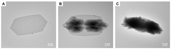 For the PCL67 series, although all three BCPs form 2D morphologies, significant differences in lamellar textural evolution are observed with increasing DP of PSar, as shown by the TEM images in Figure 6. PCL67-b-PSar34 self-assembles into monolayer lamellar crystals with elongated truncated lozenge shapes (Figure 6A). In contrast, PCL67-b-PSar69 forms lamellae containing high-density screw dislocations (Figure 6B), while PCL67-b-PSar99 exhibits surface roughening caused by excessive polymer aggregation (Figure 6C). Whereas the PCL45 series transitions to 3D spherulites with increasing DP of PSar, the PCL67 series retains 2D structures at similar weight ratios of PCL/PSar. Our findings reveal that the composition of PCL-b-PSar BCPs exerts an important influence on the self-assembled morphology, including the surface feature of the lamellae and the hierarchical structures of the assemblies. BCPs with longer PSar blocks tend to form multilayer lamellae or hierarchical structures. This behavior is probably attributed to the limited solubility of PSar in ethanol, which will be discussed in the subsequent section.