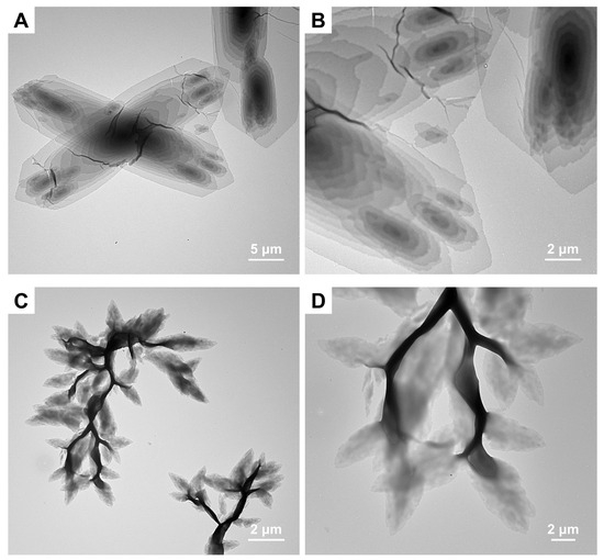 TEM images of PCL45-b-PSar28 self-assemblies prepared in different alcohol solvents with Tc1 = 33 °C and Tc2 = 8 °C: (A,B) n-butanol, Ts = 39.5 °C; (C,D) n-hexanol, Ts = 43.5 °C.