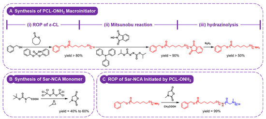 Synthesis route for PCL-b-PSar BCPs. (A) Synthesis of PCL–ONH2 macroinitiator: (i) ROP of ε-CL with benzyl alcohol/diphenyl phosphate; (ii) Mitsunobu reaction with N-hydroxyphthalimide; (iii) hydrazinolysis to expose the –ONH2 terminal group. (B) Synthesis of Sar-NCA monomer: Ring-closure of N-Boc-sarcosine with triphosgene. (C) ROP of Sar-NCA initiated by PCL–ONH2.