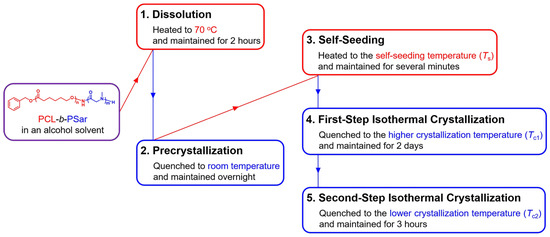 Possible CDSA mechanism of PCL-b-PSar BCPs in alcohols via the self-seeding method coupled with the two-step crystallization strategy.