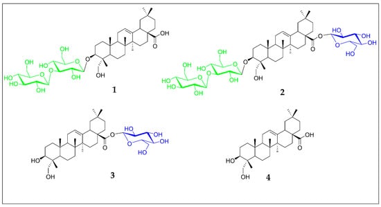 Building on our previous report on the cytotoxic activity of crude extract from the fruits of O. rubra [] as well as many studies highlighting the activity of various hederagenin-type saponins [,,], we decided to check the cytotoxic potential of the two isolated compounds bearing a distinctive 3-O-β-D-glucopyranosyl-(1→3)-β-D-glucopyranosyl sugar chain. To gain deeper insight into how subtle structural differences influence the overall activity, we included in the cytotoxicity assay not only compounds 1 and 2 but also a commercially available 28-O-β-D-glucopyranosyl hederagenin ester (compound 3) and hederagenin itself (compound 4) (Figure 1).
