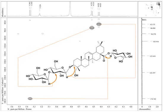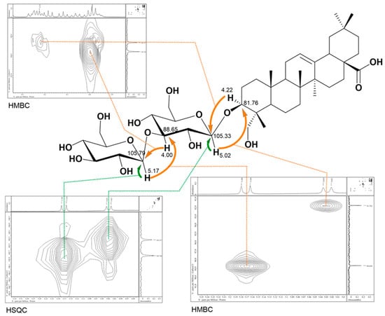 Key correlations (HMBC and HSQC) with regard to the sugar chain of compound 1. The corresponding spectra are presented in the Supplementary Materials file (Figures S3 and S4).