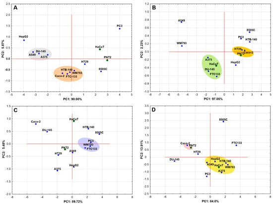 PCA score scatterplots (A–D) showing the projection of cases onto the first two principal components (PC1 and PC2). Each panel (A–D) corresponds to a specific compound: (A)—compound 1 (3-O-β-D-glucopyranosyl(1→3)-β-D-glucopyranosyl] hederagenin); (B)—compound 2 (3-O-β-D-glucopyranosyl(1→3)-β-D-glucopyranosyl] hederagenin 28-O-β-D-glucopyranosyl ester); (C)—compound 3 (28-O-β-D-glucopyranosyl hederagenin ester); (D)—compound 4 (hederagenin). Blue diamonds indicate cancer cell lines, while green circles represent normal (non-cancerous) cell lines. Colored ellipses indicate grouping tendencies. Abbreviations: HTB-140: malignant melanoma, A375: malignant melanoma, WM793: primary melanoma, HaCaT: normal keratinocytes, DU-145: metastatic prostate carcinoma, PC3: metastatic prostate carcinoma, PNT2: prostate epithelial cells, FTC133: follicular thyroid carcinoma, 8505C: undifferentiated thyroid carcinoma, Caco-2: colon adenocarcinoma, HT29: colon adenocarcinoma, HepG2: hepatocellular carcinoma, A549: lung carcinoma.