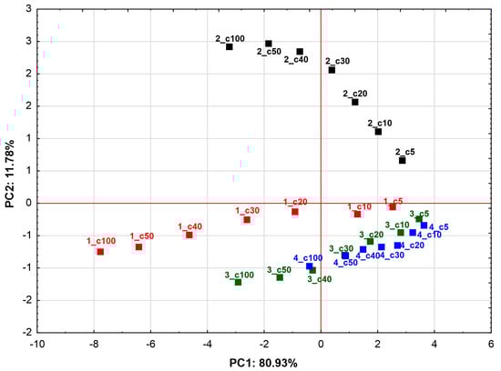 The score scatterplot of PCA model based on first two principal components (PC1 and PC2). Colored squares represent different samples (compounds tested at varying concentrations). Colors denote compounds as follows: red—compound 1 (3-O-β-D-glucopyranosyl(1→3)-β-D-glucopyranosyl] hederagenin); black—compound 2 (3-O-β-D-glucopyranosyl(1→3)-β-D-glucopyranosyl] hederagenin 28-O-β-D-glucopyranosyl ester); green—compound 3 (28-O-β-D-glucopyranosyl hederagenin ester); blue—compound 4 (hederagenin). Each sample is labelled with a code in the format Z_cX, where Z indicates the compound number (1–4) and cX specifies the concentration in μg/mL. For example, 1_c50 corresponds to compound 1 at 50 μg/mL.
