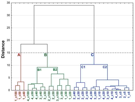 Dendrogram of similarity among investigated compounds 1–4 at different concentrations (dashed horizontal line indicates that the grouping has been stopped according to Mojena’s rule). Clusters were marked with subsequent letters: A, B, C, and distinguished by colors (A—red; B—green; C—blue). Each sample is labelled with a code in the format Z_cX, where Z indicates the compound number (1–4) and cX specifies the concentration in μg/mL. For example, 1_c50 corresponds to compound 1 at 50 μg/mL. Abbreviations: 1—compound 1 (3-O-β-D-glucopyranosyl(1→3)-β-D-glucopyranosyl] hederagenin); 2—compound 2 (3-O-β-D-glucopyranosyl(1→3)-β-D-glucopyranosyl] hederagenin 28-O-β-D-glucopyranosyl ester); 3—compound 3 (28-O-β-D-glucopyranosyl hederagenin ester); 4—compound 4 (hederagenin).