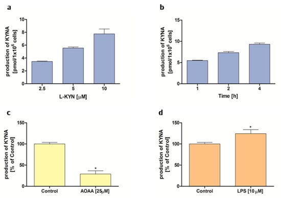 KYNA production by THP-1-derived macrophages: the influence of (a) concentration of substrate, L-KYN; (b) incubation time; (c) 25 µM AOAA; and (d) 10 μg/mL LPS on KYNA production in THP-1-derived macrophages. Data are presented as mean ± SD; (*) p < 0.05 vs Control.