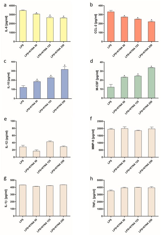 Influence of KYNA on the production of cytokines and chemokines (a) IL-6, (b) CCL-2, (c) IL-10, (d) M-CSF, (e) IL-12, (f) MMP-9, (g) IL-1β, and (h) TNFα, by THP-1-derived macrophages exposed to LPS. Data are presented as mean ± SD; (*) p < 0.05 vs. LPS.