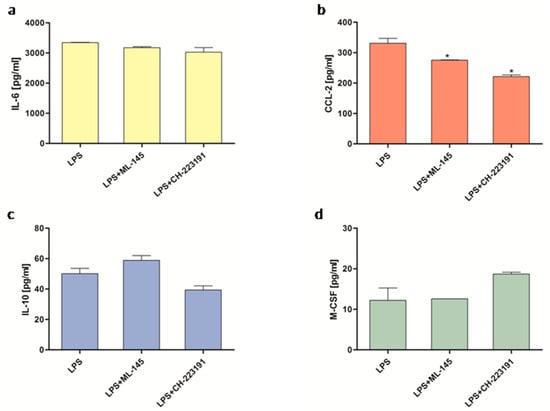 Influence of CH-223191 (an AHR antagonist) and ML-145 (a GPR35 antagonist) on the production of cytokines and chemokines (a) IL-6, (b) CCL-2, (c) IL-10, and (d) M-CSF by THP-1-derived macrophages. Data are presented as mean ± SD; (*) p < 0.05 vs LPS.