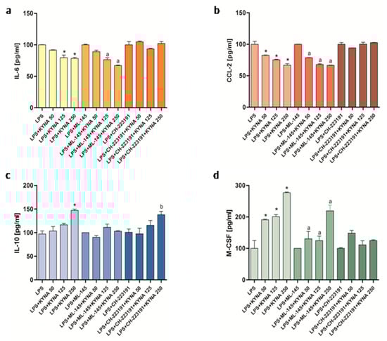 Influence of KYNA on the production of cytokines and chemokines (a) IL-6, (b) CCL-2, (c) IL-10, and (d) M-CSF by THP-1-derived macrophages in the presence of CH-223191 (an AHR antagonist) and ML-145 (a GPR35 antagonist). Data are presented as mean ± SD; (*) p < 0.05 vs. LPS group; (a) p < 0.05 vs. LPS + ML-145 group; (b) p < 0.05 vs. LPS + CH-223191 group.