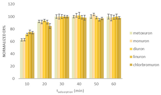 Evaluation of the adsorption time of the FPSE method. Concentration of the selected analytes: 100.0 μg L−1 (n = 3).