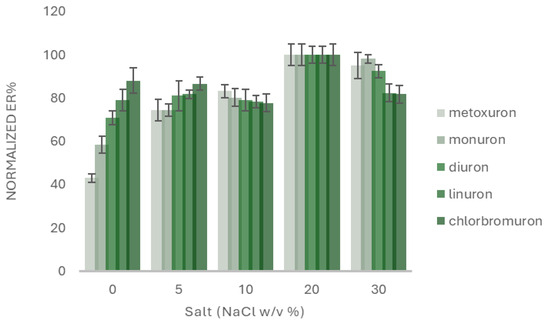 Finally, the effect of salt addition was studied. For this reason, NaCl was added to the sample, as model electrolyte, in the range from 0% w/v to 30% w/v. As shown in Figure 2, the extraction recovery values were increased by increasing the salt concentration. This phenomenon is attributed to the salting out effect, in which the solubility of the analytes is reduced improving the analytes affinity to the sorptive phase [16]. Hence, 20% w/v NaCl was selected.