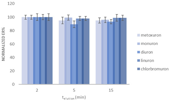 Finally, optimization of the elution time was conducted in order to find the minimum time span required for sufficient desorption. The elution time was studied between 2 and 15 min and the experimental results are shown in Figure 3. The results were similar at all time spans investigated. Hence the minimum value of 2 min was selected as the optimum elution time to minimize sample preparation time.