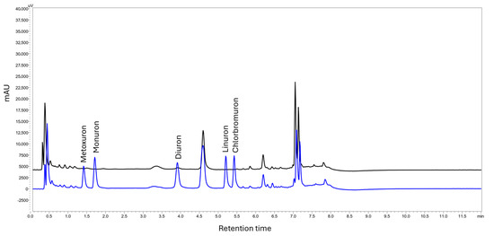 A representative chromatogram of a blank (black) and a spiked (c = 50.0 μg L−1) river water sample (blue) analyzed through the proposed MI-FPSE-HPLC-DAD method. Retention times: metoxuron 1.4 min, monuron 1.7 min, diuron 3.9 min, linuron 5.2 min, and chlorbromuron 5.4 min.