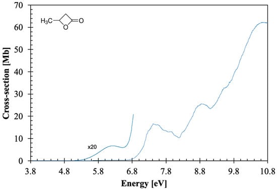 The photoabsorption spectrum of β-butyrolactone, CH3CHCH2CO2, in the 3.8–10.8 eV photon energy range.