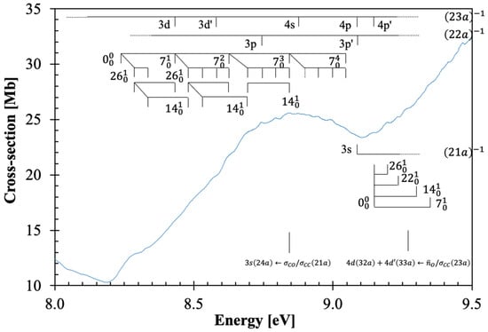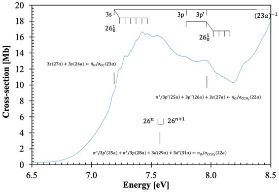 Ab initio quantum chemical calculations have been performed at the DFT/TD-DFT [32,33] level with a CAM-B3LYP functional [34], and the aug-cc-pVTZ basis set as implemented in the GAMESS-US computational package [35], while those at the EOM-CCSD/aug-cc-pVDZ level have been obtained with Psi4 [36]. The features in the photoabsorption spectrum (Figure 1, Figure 2, Figure 3 and Figure 4) have been assigned with the help of TD-DFT calculations on the vertical excitation energies and oscillator strengths. The major electronic excitations are in Table 1 together with the experimental values and their cross-section values. In Table S1 a complete set of the calculated electronic transitions can be found together with oscillator strengths, while Table S2 contains complementary lowest-lying electronic excitations up to 8.7 eV obtained at the EOM-CCSD/aug-cc-pVDZ level. The calculated harmonic frequencies for the neutral electronic ground state and cation electronic ground state, in Tables S3 and S4 are used to assign the main fine structure in the mixed valence-Rydberg and Rydberg excitations in the photoabsorption spectrum (Figure 1, Figure 2, Figure 3 and Figure 4).