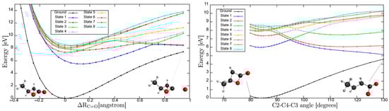 The nuclear dynamics governing the intricate molecular landscape is responsible for a relevant instability in β-butyrolactone ring integrity upon electronic excitation. To further our knowledge on the underlying mechanism responsible for ring opening, we have performed calculations at the TD-DFT/CAM-B3LYP/aug-cc-pVDZ level of theory in the C1 symmetry group. These have allowed the computation of potential energy curves (PECs) for the ground and the eight lowest-lying singlet excited states, following the C=O coordinate and the C2-C4-C3 dihedral angle, while maintaining all other internuclear distances and angles frozen at the ground state equilibrium values, with results shown in Figure 5 (for atom numbering, see Figure S1).