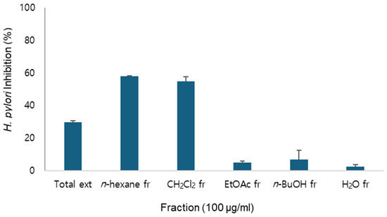 Among these, the n-hexane and CH2Cl2 fractions exhibited anti-H. pylori activity (Figure 1) and exhibited similar HPLC chromatograms. Therefore, they were combined for further purification.