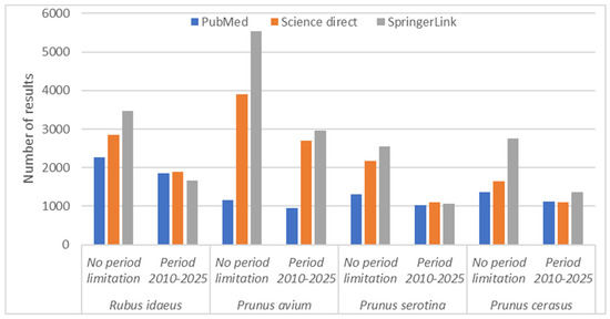 More general terms, such as plant waste, twigs, biomass, or extraction of phenolic compounds, generated a very large number of results (over 26,000 for prunus woody biomass and over 16,000 for Rubus woody biomass). However, only those sources that were directly related to the species analyzed were retained for evaluation.